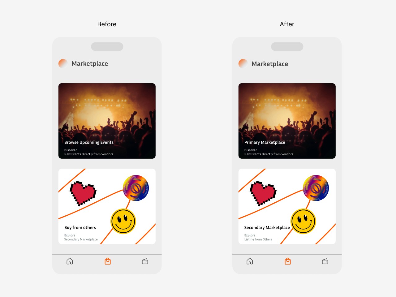 Users had trouble distinguishing between the primary and secondary marketplace buttons due to unclear copy. I resolved this by using more direct labels, improving navigation clarity.