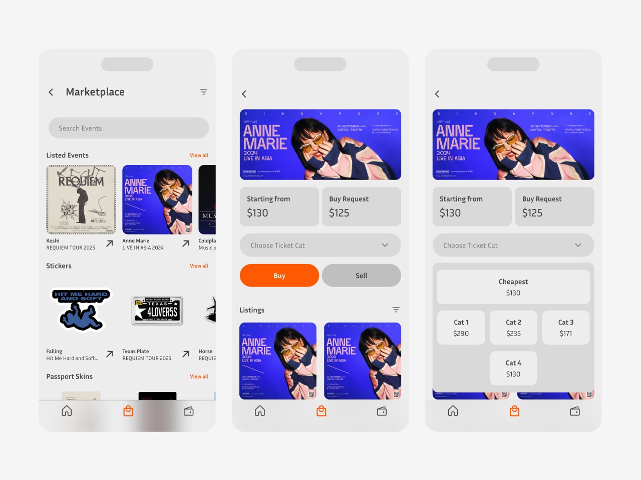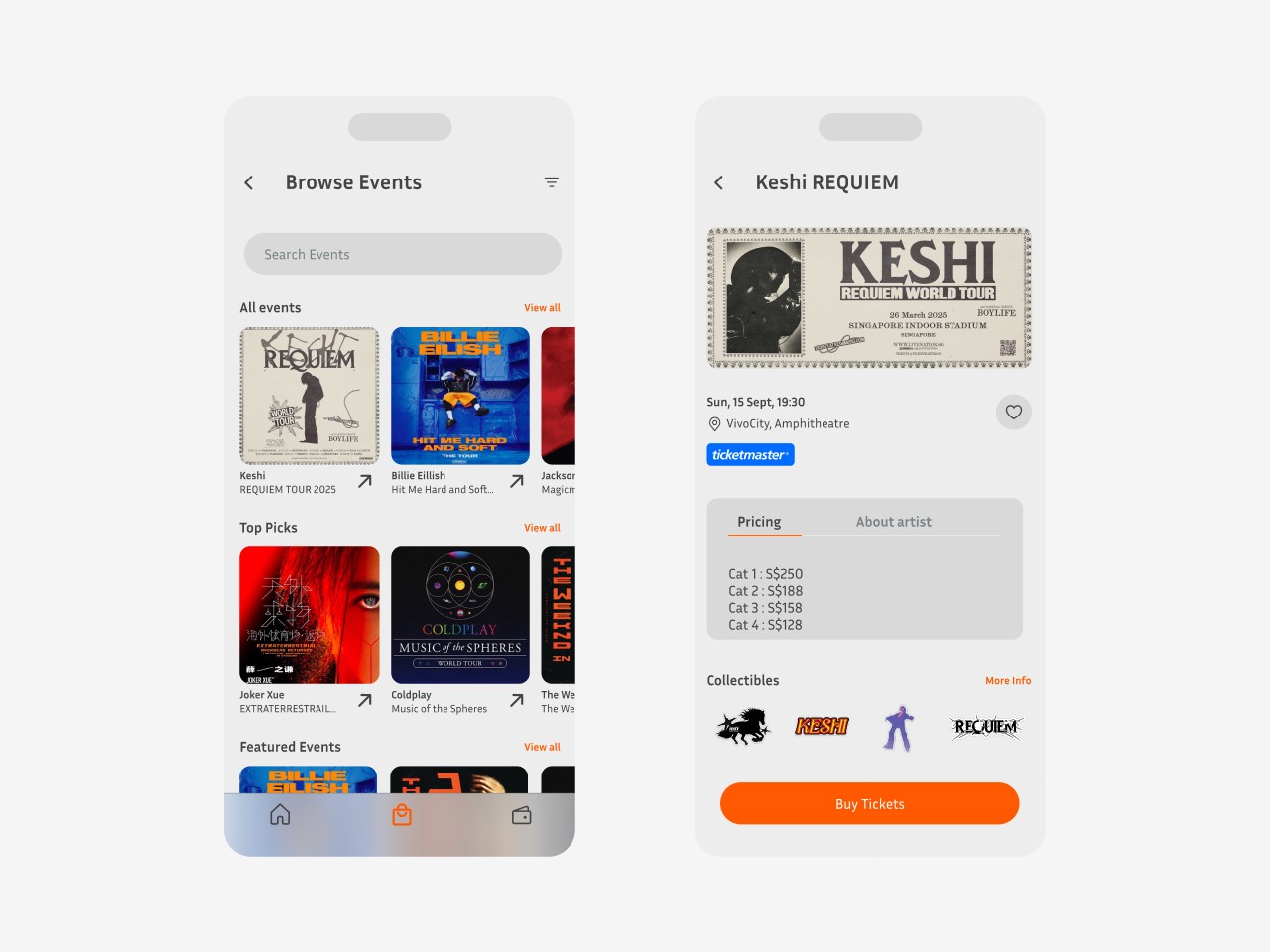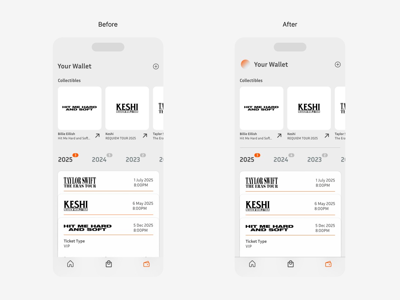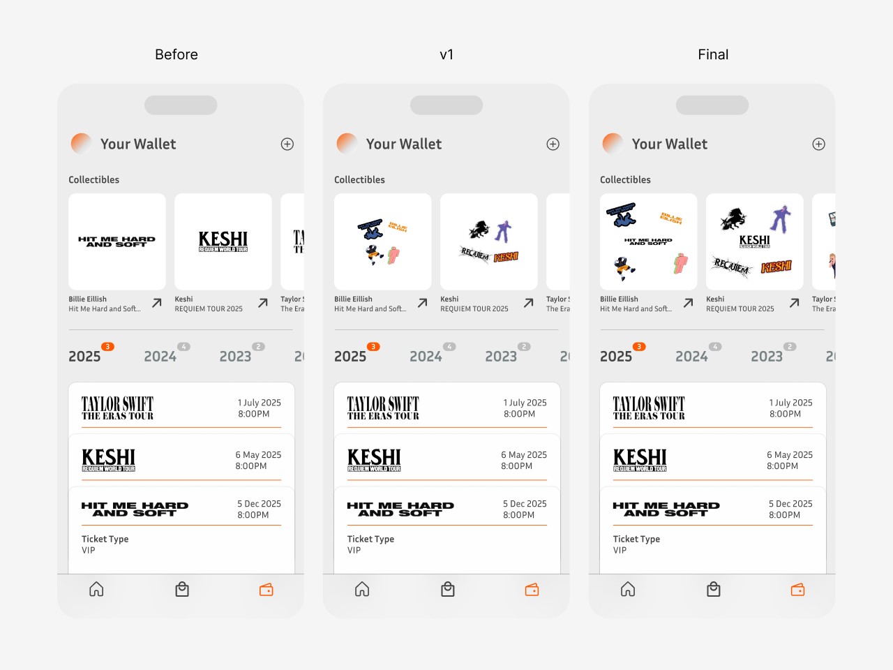 During testing, I found that a simple divider wasn't enough to differentiate the two sections. I explored using collectible in buttons instead, initially without the concert logo (v1). However, AB testing revealed a loss of context, so I refined the final version to include both the collectibles and the concert logo for better clarity.