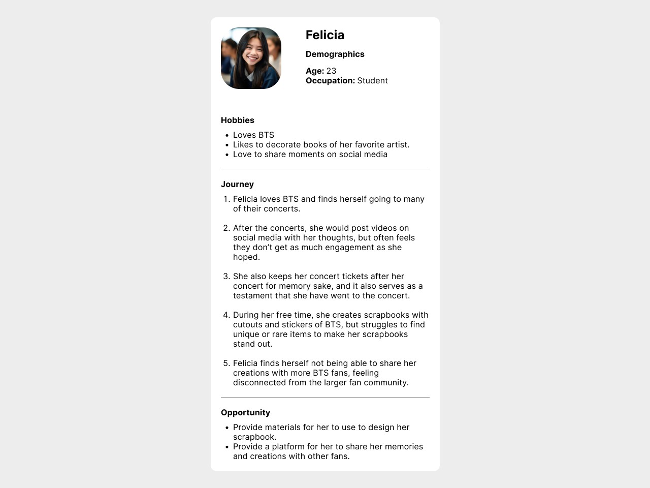 A second persona is created based on concert go-ers who collects event items. The users in this journey are based on real-life scenarios to ensure accuracy and relevance.