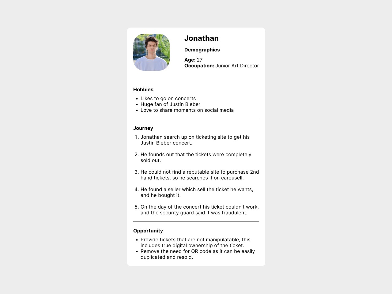Drawing from the information above, I developed a basic user persona to illustrate the general journey of a concert go-er experiencing a scam. The users in this journey are based on real-life scenarios to ensure accuracy and relevance.