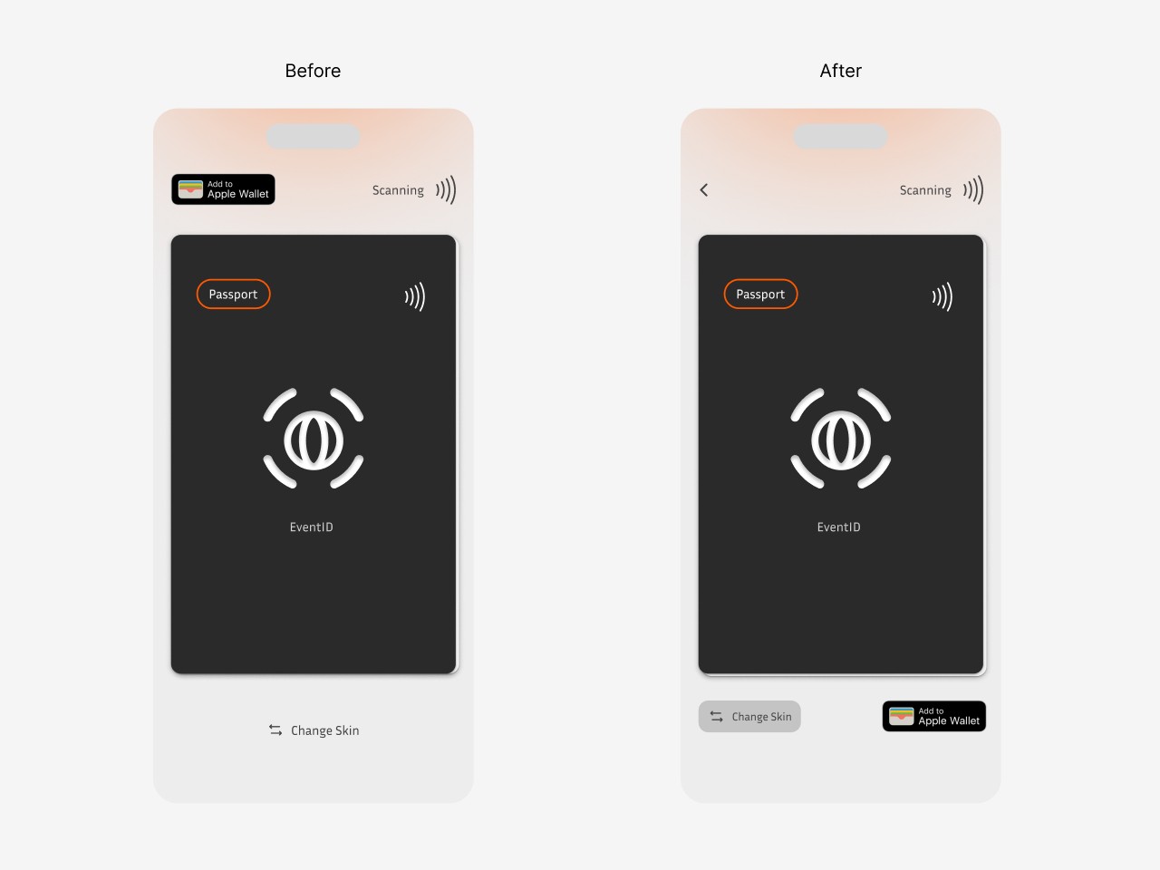 Testing revealed a flow issue, users couldn’t return to the home screen from this page. To resolve it, I added a back button, updated the layout, and also introduced a background layer to the "Change Skin" button to improve its clarity and distinguish it from the adjacent "Apple Wallet" button.
