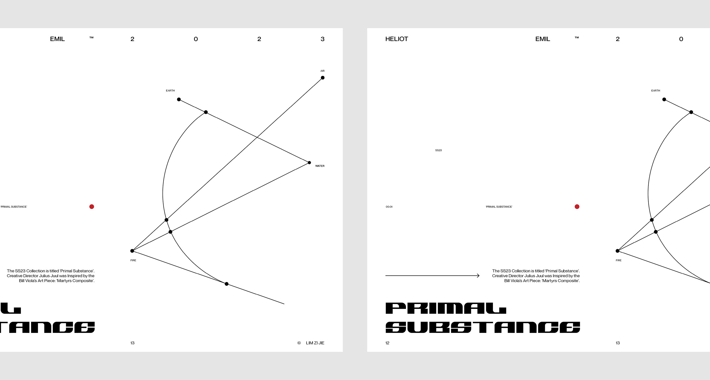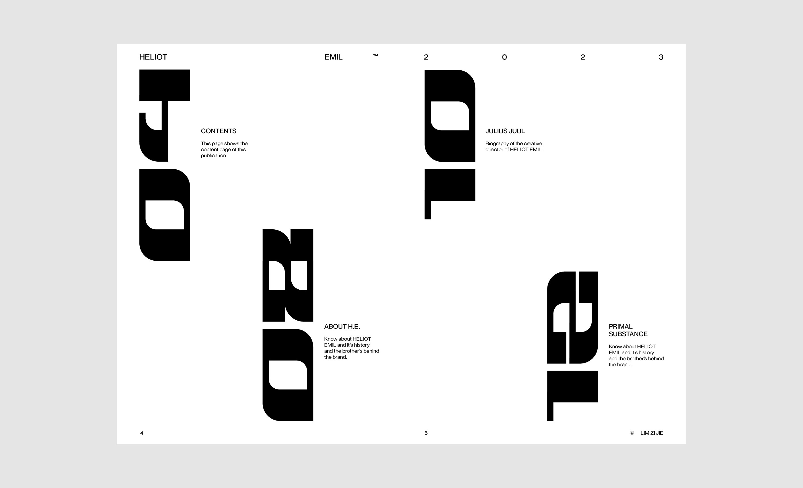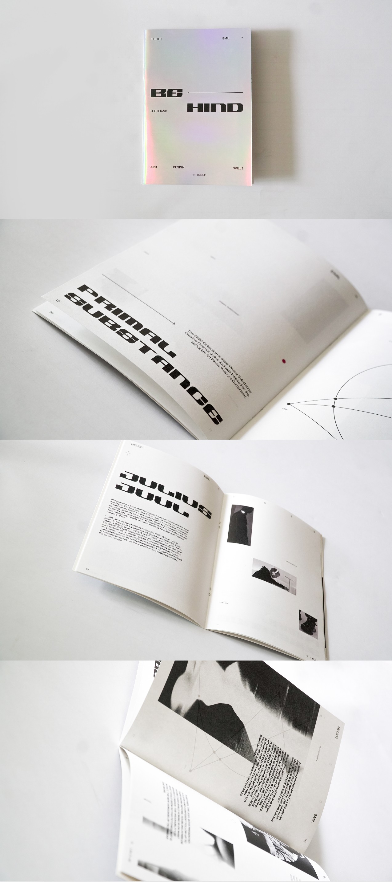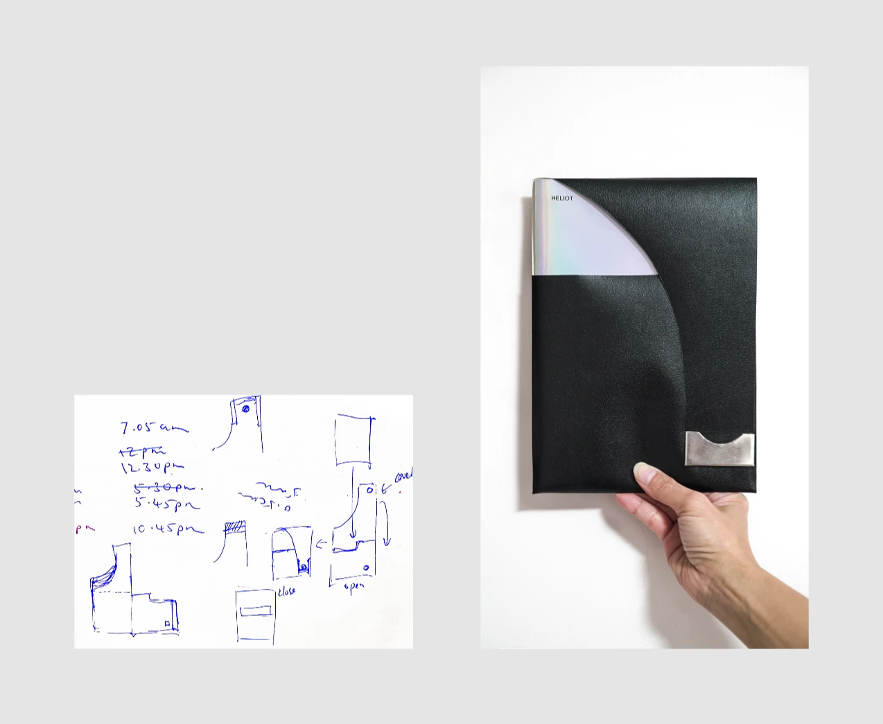 The book sleeve design draws inspiration from HELIOT EMIL pieces, which often feature curved designs with metal accents. The chosen material, a black leather-textured paper, conveys a sense of quality and luxury, mirroring the high-end nature of the brand.